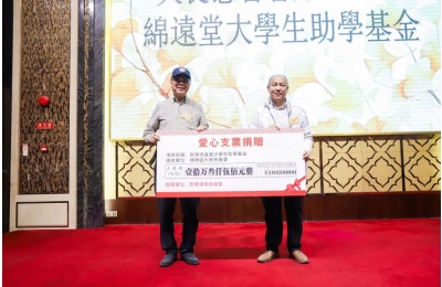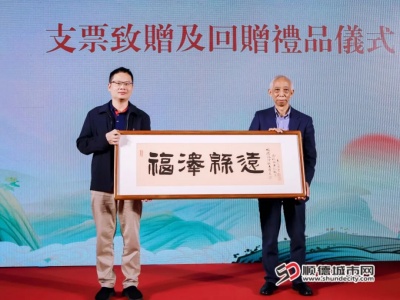 在联谊晚宴上,旅港顺德绵远堂主席李定国向凤城敬老院移交65万元捐赠支票,大良街道党工委书记钟德慰作为代表回赠由中国书法家协会会员李良晖创作的书法作品。