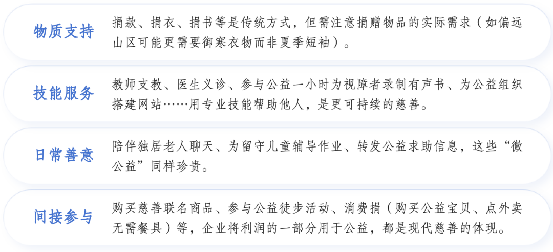 今天的慈善正在变得日常化、年轻化: 开启“环保点餐”:点外卖时选择“无需餐具”,用环保行动响应公益; 参与“爱心捐赠”:捐赠全新或八成新的衣物、书籍,为偏远地区儿童送去开学礼物; 践行“绿色购物”:自备环保袋买菜、优先选择简包装商品,日常消费也能助力环保……