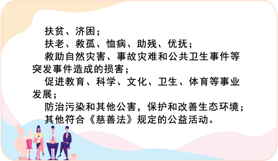 《慈善法》第三条明确界定了慈善活动的范围,即自然人、法人和非法人组织通过捐赠财产或提供服务等方式,自愿开展的公益活动,具体包括: